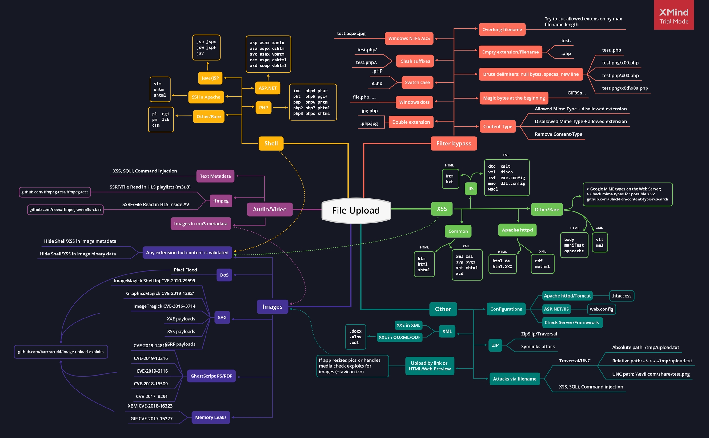 ASP,ASPX,PHP5,PHP,PHP3: Webshell, RCESVG: Stored XSS, SSRF, XXEGIF: Stored XSS, SSRFCSV: CSV injectionXML: XXEAVI: LFI, SSRFHTML,JS: HTML injection, XSS, Open redirectPNG,JPEG: Pixel flood attack (DoS)ZIP: RCE via LFI, DoSPDF,PPTX: SSRF, BLIND XXESCF: RCE